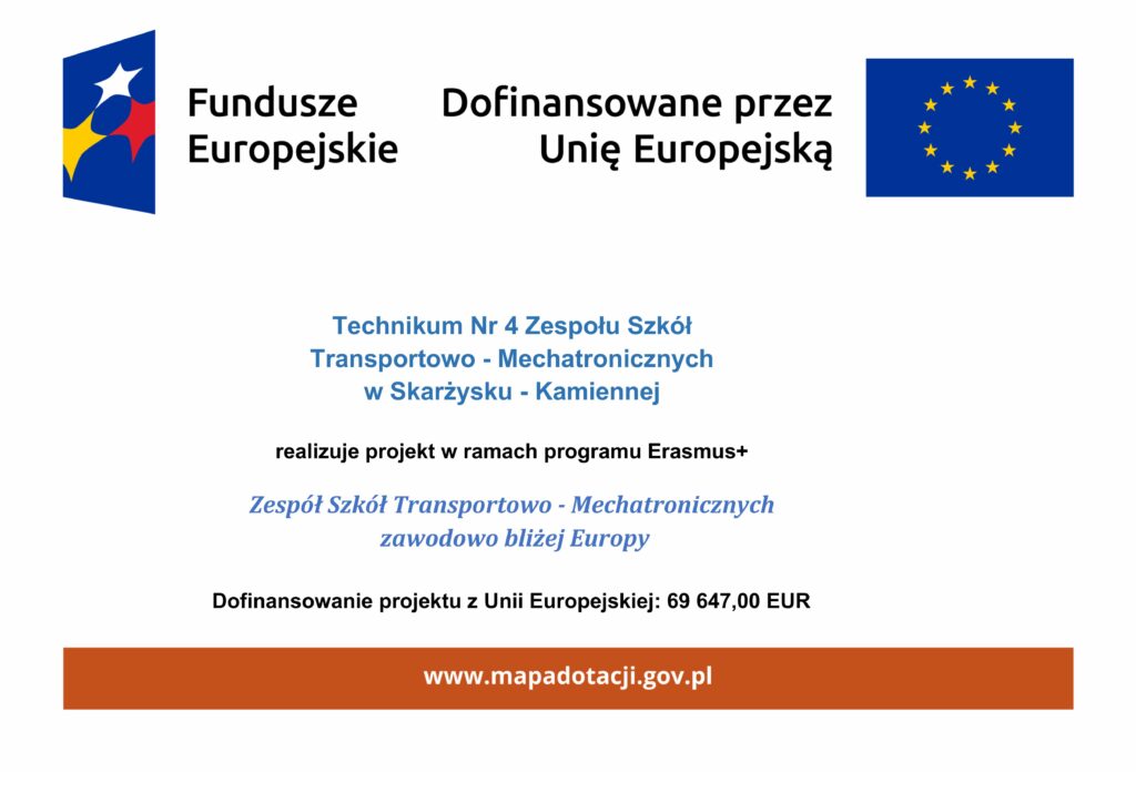 Zespół Szkół Transportowo – Mechatronicznych realizuje projekt pt. „Zespół Szkół Transportowo-Mechatronicznych zawodowo bliżej Europy” Przedsięwzięcie o numerze 2025-1-PL01-KA122-VET-000330092 jest realizowane w ramach Programu Erasmus+ jako krótkoterminowy projekt na rzecz mobilności osób uczących się oraz kadry w sektorze kształcenia i szkolenia zawodowego (KA122-VET), finansowany ze środków Unii Europejskiej na lata 2021 – 2027 z budżetu Komisji Europejskiej. Uczestnikami projektu są uczniowie oraz nauczyciele przedmiotów zawodowych Technikum Nr 4 Zespołu Szkół Transportowo – Mechatronicznych w Skarżysku – Kamiennej.